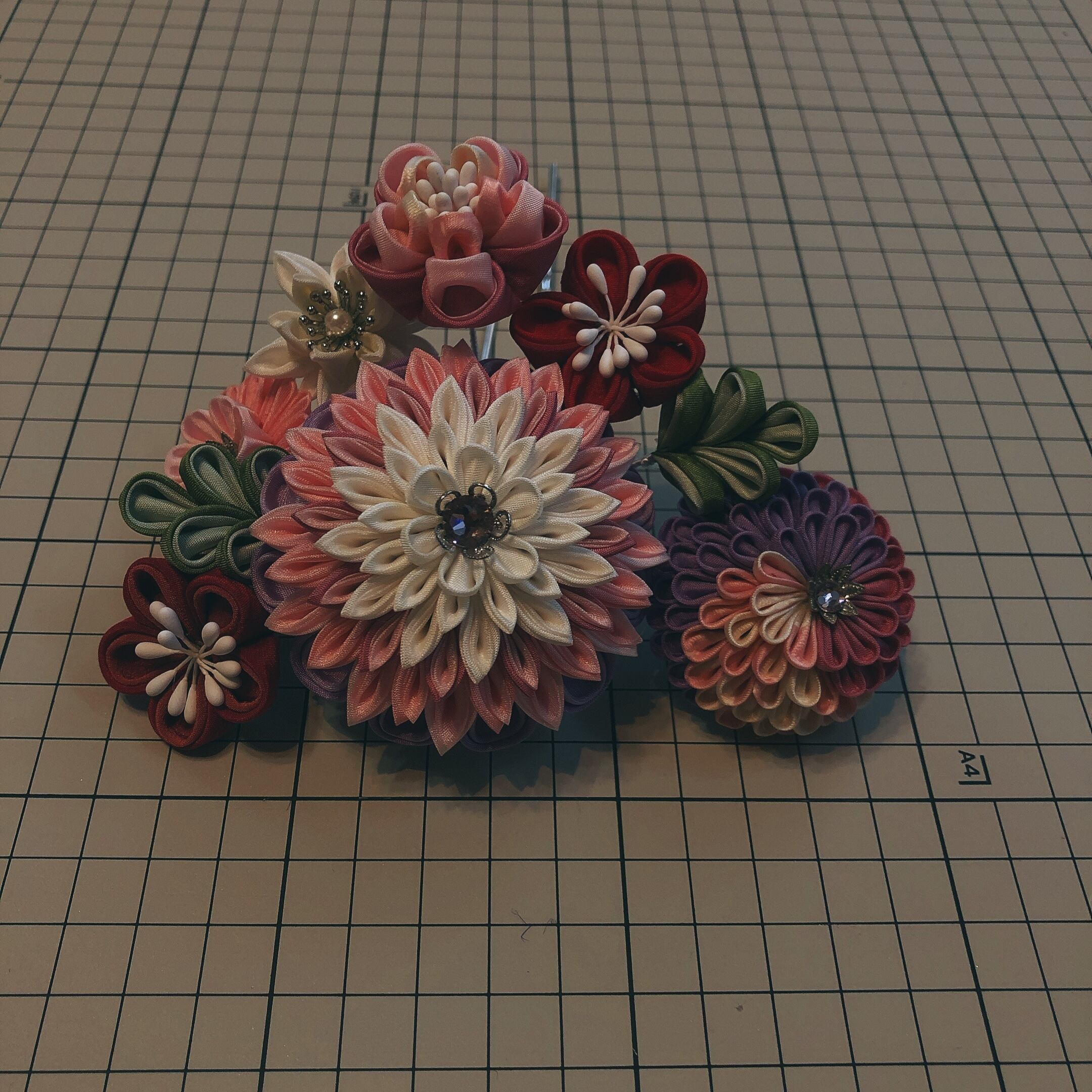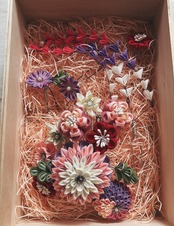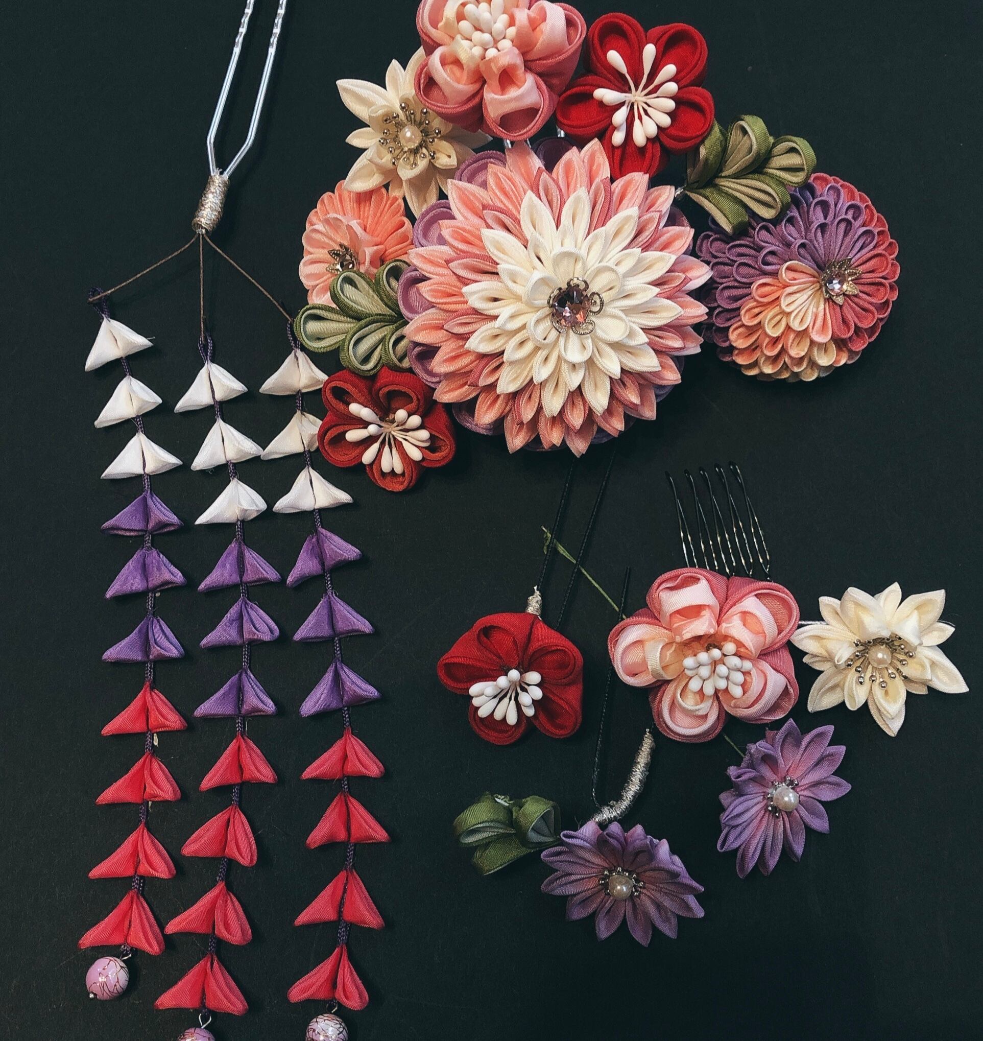 日本伝統手工芸である、つまみ細工のヘアアクセサリーです。京都丹後の羽二重を使い1枚1枚丁寧に仕上げました。華やかなメインのかんざしは、中心の半くす玉。桃色と白を使い可愛らしい純粋さを、周囲を取り巻く花々は、少しトーンを落としながらも、メインを引き立てます。下がりはお嬢様の証。成人式ご婚礼をお迎えのお嬢様を上品に演出致します。上質のお着物には、是非清楚でより美しいものをお選びいただけたらとお作りしました。