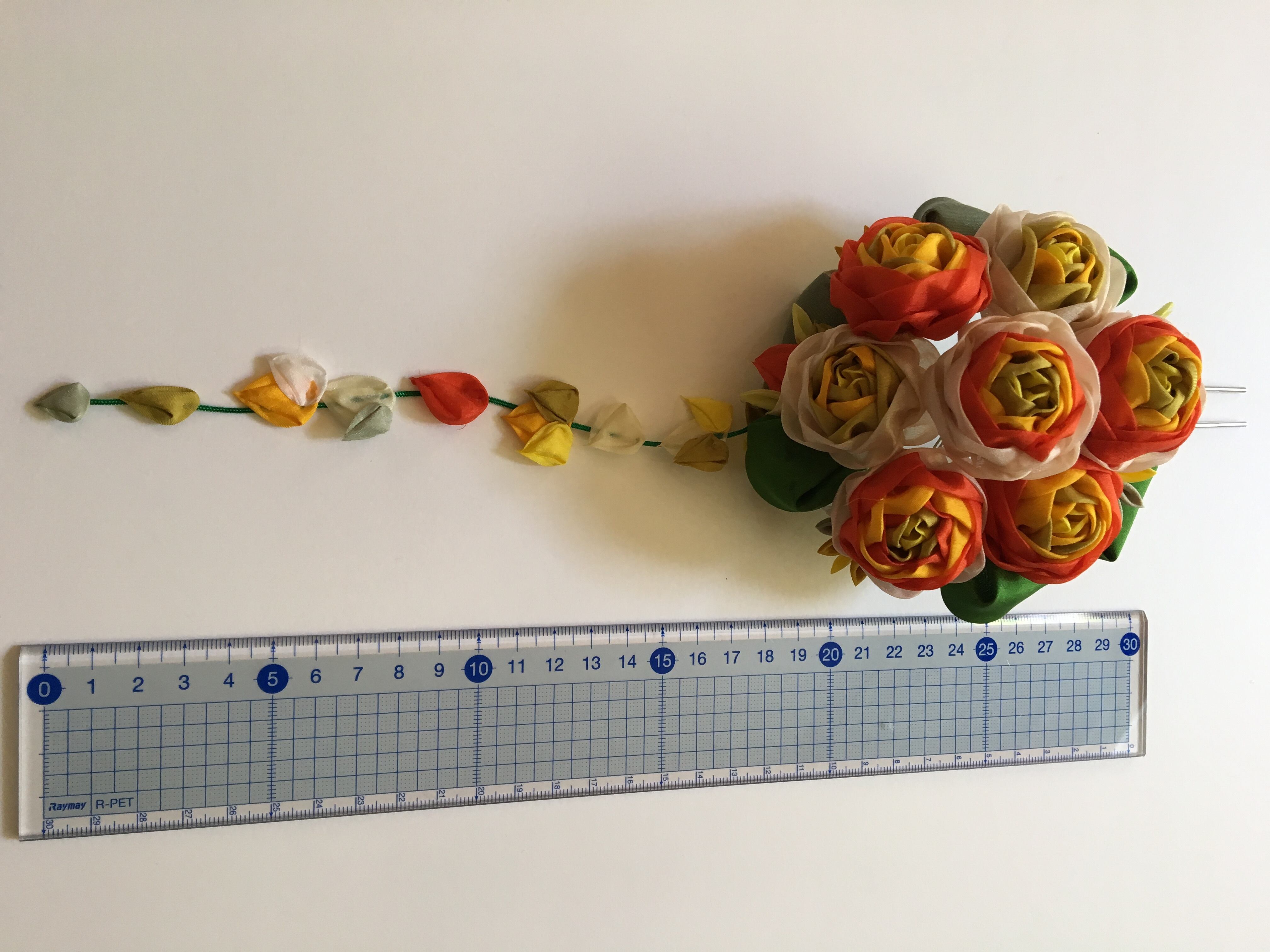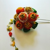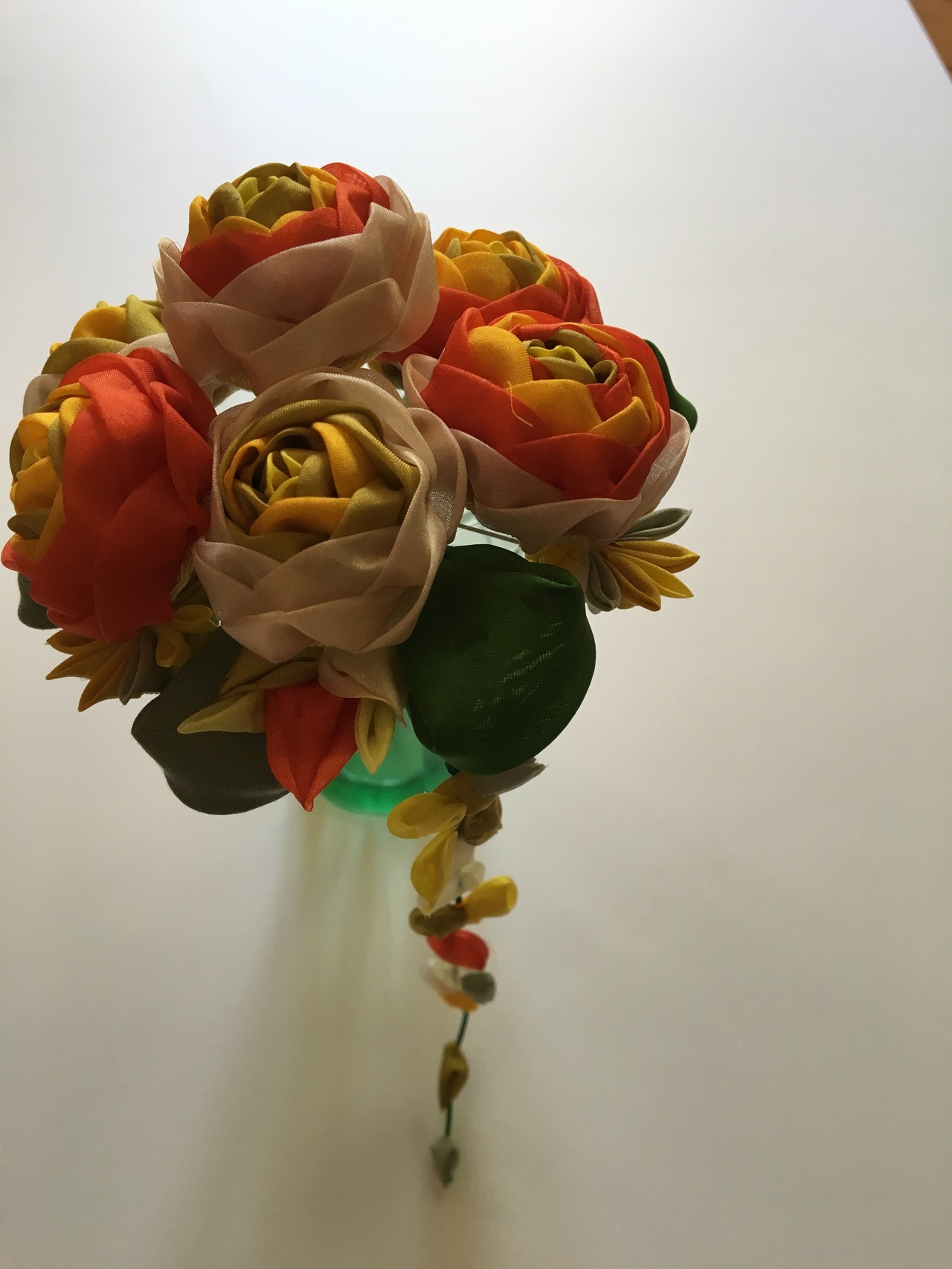 オレンジや金糸がベースの古典的なお着物でもよく似合う逸品です。オールドローズが7輪が一つになった大きなものですが、下がりが一筋のみのユニークなデザインです。